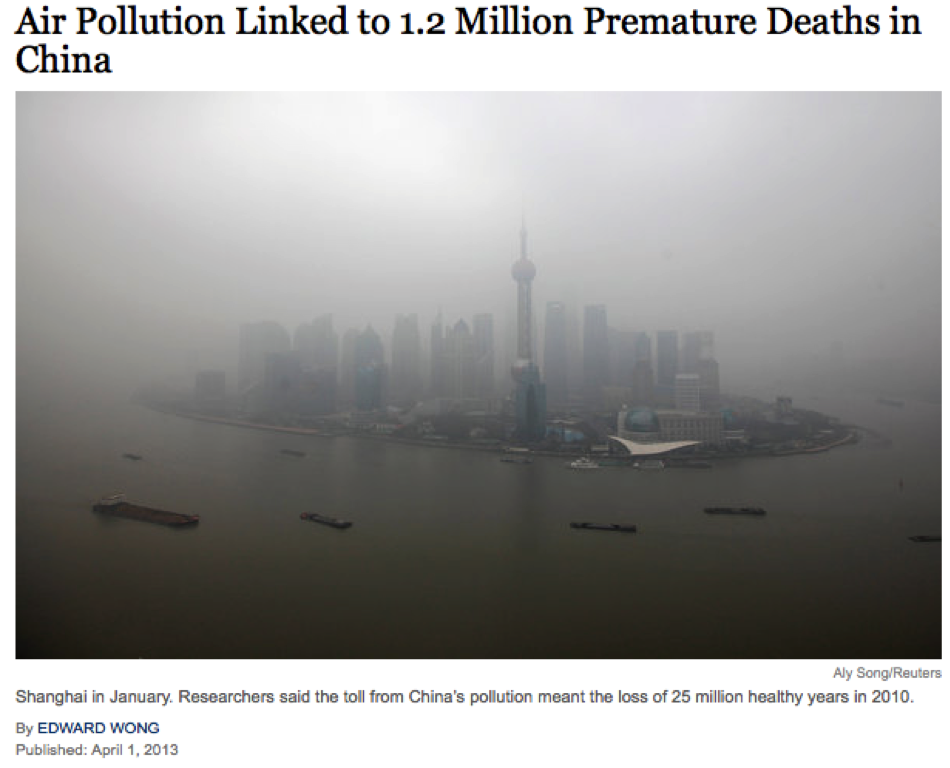 Pollution: Pollution of air water and soil is problem 1, 2 and 3 in China. It is estimated that 350,000-400000 people die prematurely each year due to air pollution. Air pollution contributed to 1.2 million premature deaths in China in 2010, making it the 4th leading cause of such deaths in China.