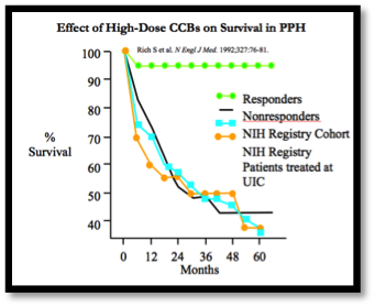 Pulmonary arterial hypertension (PAH) is a lung vascular disease in which the blood pressure in the lung circulation (called the mean pulmonary artery pressure) is elevated to over 25 mmHg. The rise in pressure is due several factors: blood vessel contraction (called vasoconstriction) and blood vessels blockage or destruction, due to excessive cell growth (proliferation) and insufficient cell removal (apoptosis), as reviewed in Circulation. 2010; 121: 2045-2066. The World Heath Organization (WHO) has a classification system for pulmonary hypertension (PH), recognizing 5 types. However, it is clear that within even WHO Group 1 pulmonary hypertension there are likely dozens of discrete diseases, each with their own deep phenotype. Despite 9 approved drug treatments, half of all PAH patients die within 5-years of diagnosis. However, Dr. Stuart Rich identified a subset of PAH patients that has a much better prognosis (see graph above). This group (approximately 10% of PAH patients) responds to the administration of a blood vessel relaxing drug (such as inhaled nitric oxide or a calcium channel blocker, such as nifedipine) with a marked drop in mean pulmonary artery pressure and a rise in cardiac output. These patients usually live many years.
