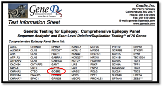 This discovery (which resulted from arduous work) resulted in a simple test that can now be ordered from a doctor’s office. There are now diagnostic panels (such as the one below) in which GOSR2 or Membrin mutations (circled in red) can be identified, along with 69 other known genetic causes of epilepsy! The main challenges of such testing are financial (cost to patients or payers) and ethical (there is always a need for genetic counselling).