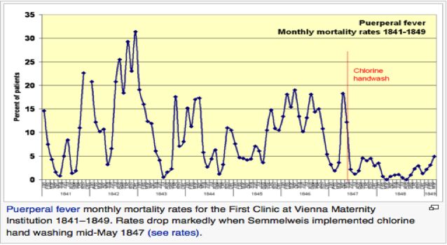 Even the disruptive idea of patient-centred care is now truly new. An early colleague of Dr. Holland, Dr. Semmelweis, attempted to make things better for patients back in the mid 1800s. This Hungarian born physician was run out of his hospital in Vienna for insisting that MDs wash their hands before delivering babies. He came to this disruptive idea after observing triple the rates of puerperal sepsis in women delivered by MDs (who were coming to the maternity ward from the morgue) vs. midwives. Although he showed that hand washing reduced death rates to 1% in these women (See graph) he was ostracized and became depressed and was ultimately institutionalized. He died of a beating by his guards at age 47 years. For his disruptive idea (disrupting the practices of obstetricians) he was ridiculed. Of course, he was correct in his ideas (sadly the Germ theory awaited Lister and Pasteur several decades later).