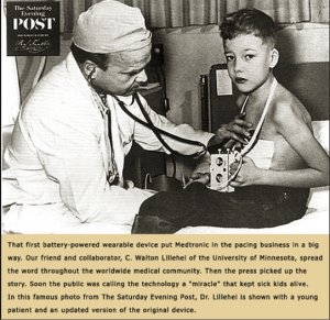 He worked closely with a pioneering surgeon, C. Walton Lillehei at the University of Minnesota. Dr. Lillehei needed pacemakers for his own innovative practice (early cardiac surgery). In the 1950s these devices were large and ran off of electricity from wall plugs. A power failure in Minneapolis endangered one of Lillehei’s patients and he asked Bakken to create a battery-operated device.
