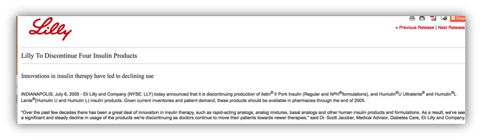 It is true that in time we learned to make insulin bacteria using recombinant DNA technology..but the journey began in animals. As some reassurance to those opposed to animal research, the use of large animals in research is decreasing as our biologic precision increases. In the case of insulin, science overtook the need for porcine sources for insulin and in 2005 Eli Lilly issued the announcement that it was discontinuing porcine insulin production.