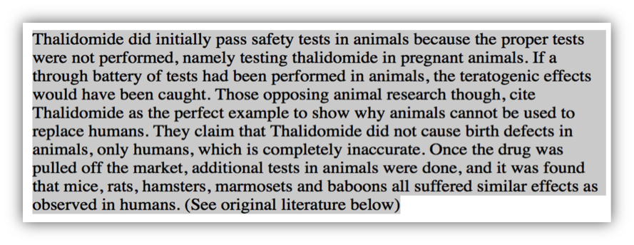 Like human research the validity depends in large part on the rigour with which the study is conducted. As you will see below, thalidomide, the disastrous anti-emetic was marketed to pregnant women in Canada with inadequate animal research (and catastrophic consequences). Approval was not preceded by proper testing in animals. When (too late) it was tested in various species of pregnant animals it caused the same birth defects as in humans. In the USA, the drug was withheld form the public for lack of evidence, ironically by a Canadian. Dr. Frances Kelsey, a BC native who is now over 100 years of age. Dr. Kelsey was recently interviewed regarding how she declined to recommend thalidomide. As a rookie Food and Drug Administration (FDA) scientists handling the Thalidomide file, she felt the preclinical and clinical evidence was inadequate and, much to the dissatisfaction of the manufacturer, the William S. Merrell Co. of Cincinnati, slowed the approval of thalidomide. Unfortunately this damage to fetuses was not anticipated in Canada and the drug was approved and used.