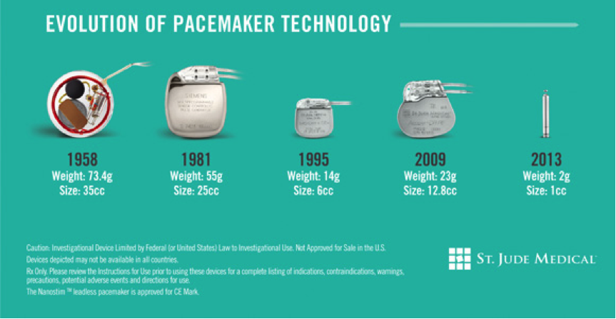 This Figure shows the miniaturization of pacemakers culminating in 2014 with the leadless device (St Jude Medical).