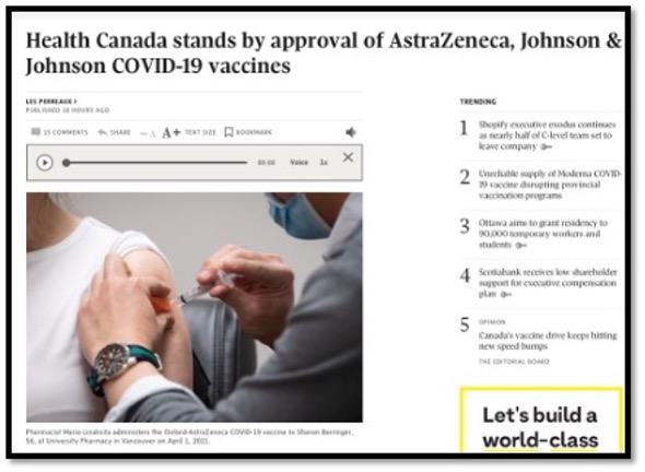 3) Astra Zeneca Vaccine has a strong safety record and is recommended by Health Canada after its recent review (click here): The latest on the vaccine induced thrombosis and thrombocytopenia (VITT) story